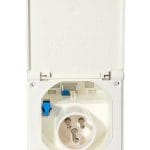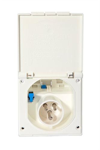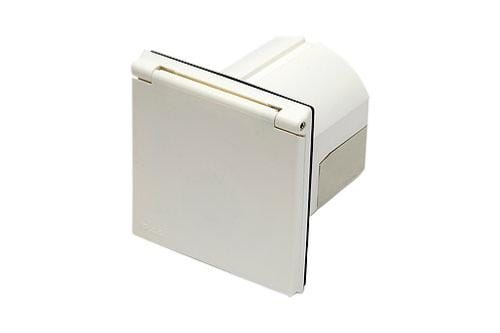 Compact, flush-mounted mains hook-up inlet plug housed in a recessed box with hinged cover, providing a convenient hook-up access point for caravans, motorhomes, campervans etc. Black housing fitted with a foam gasket to seal against body of the vehicle.